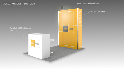 Zabudowa stoiska - ścianka o szerokości 1,5 m 1 szt., lada 1 szt., wykonane z modułów beMatrix; wyposażenie stoiska - krzesło typu hoker; 2 zaproszenia do udziału w wydarzeniu, logo wystawcy na stronie wydarzenia.