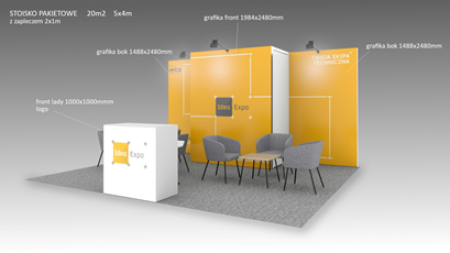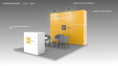 Zabudowa stoiska - ścianka o szerokości do 3 m 1 szt., lada 1 szt., wykonane z modułów beMatrix; wyposażenie stoiska - krzesło typu hoker, fotel 3 szt., stolik 1 szt.; 3 zaproszenia do udziału w wydarzeniu, logo wystawcy na stronie wydarzenia.