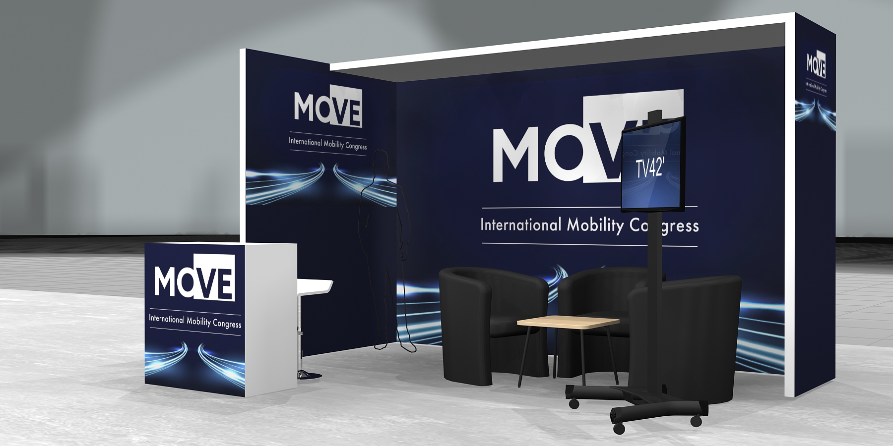 Elements of the stand equipment: three black armchairs, low coffee table, counter, high bar chair, 42'' TV on a stand, A4 brochure rack, two 230 V outlets.