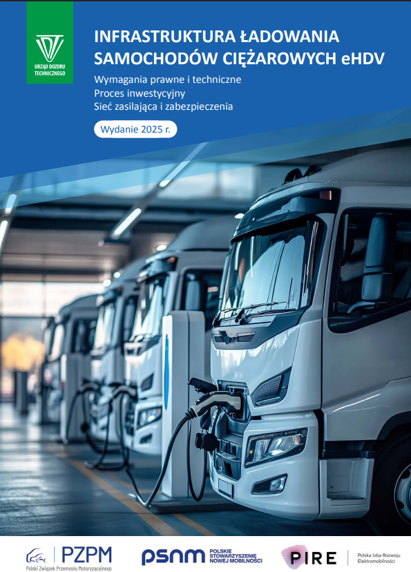 Urząd Dozoru Technicznego prezentuje najnowsze opracowanie pt. „Infrastruktura ładowania samochodów ciężarowych eHDV” – praktyczny przewodnik dla wszystkich, którzy chcą aktywnie uczestniczyć w rozwoju nowoczesnego i bezpiecznego systemu ładowania dla elektrycznych pojazdów ciężarowych. Publikacja stanowi źródło wiedzy dla inwestorów, projektantów, operatorów stacji ładowania, a także przedstawicieli administracji publicznej. Przedsięwzięcie powstało we współpracy z Polską Izbą Rozwoju Elektromobilności, Polskim Stowarzyszeniem Nowej Mobilności oraz Polskim Związkiem Przemysłu Motoryzacyjnego.